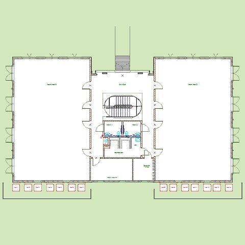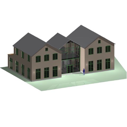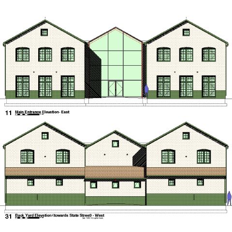 Design Concept- New building will mimic industrial characteristics of adjacent buildings in Stocking Works complex, including gable forms, exterior surfacing, window types, exposed structure and roof on interior, and exterior surface colors.
